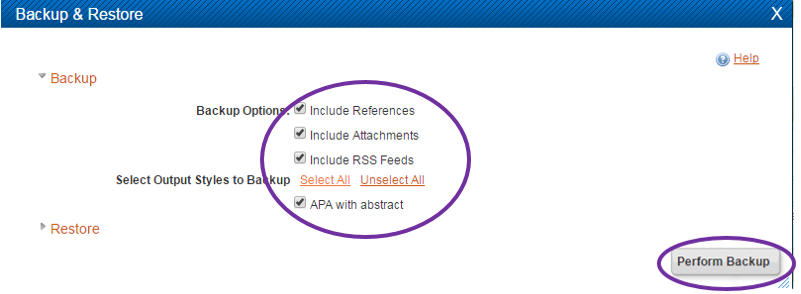 3. By default INCLUDE REFERENCES; INCLUDE RSS FEEDS; INCLUDE ATTACHMENTS; and all your customized OUTPUT STYLES are all selected. If you do not want any of these make sure to deselect them. Choose PERFORM BACKUP.